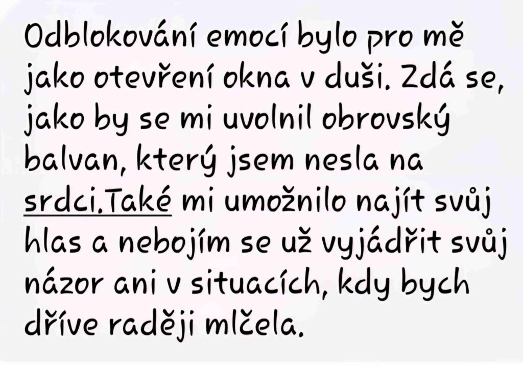 Začala jsem zkoušet odblokování emocí na sobě, své rodině a postupně na mých přátelích atd. A výsledky byly fenomenální – velká úleva, pocit větší radosti, zbavení se strachů, traumat, bolestí.